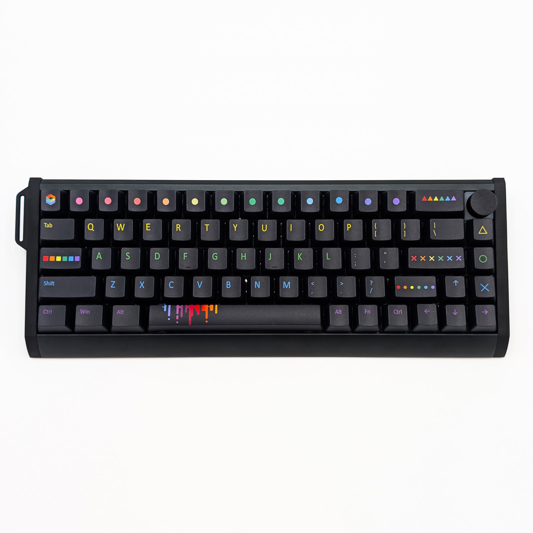 Side shot of PAINTWORKS QWERTY PBT keycaps on a mechanical keyboard, featuring OEM profile keys with Black Keycaps and Rainbow Text