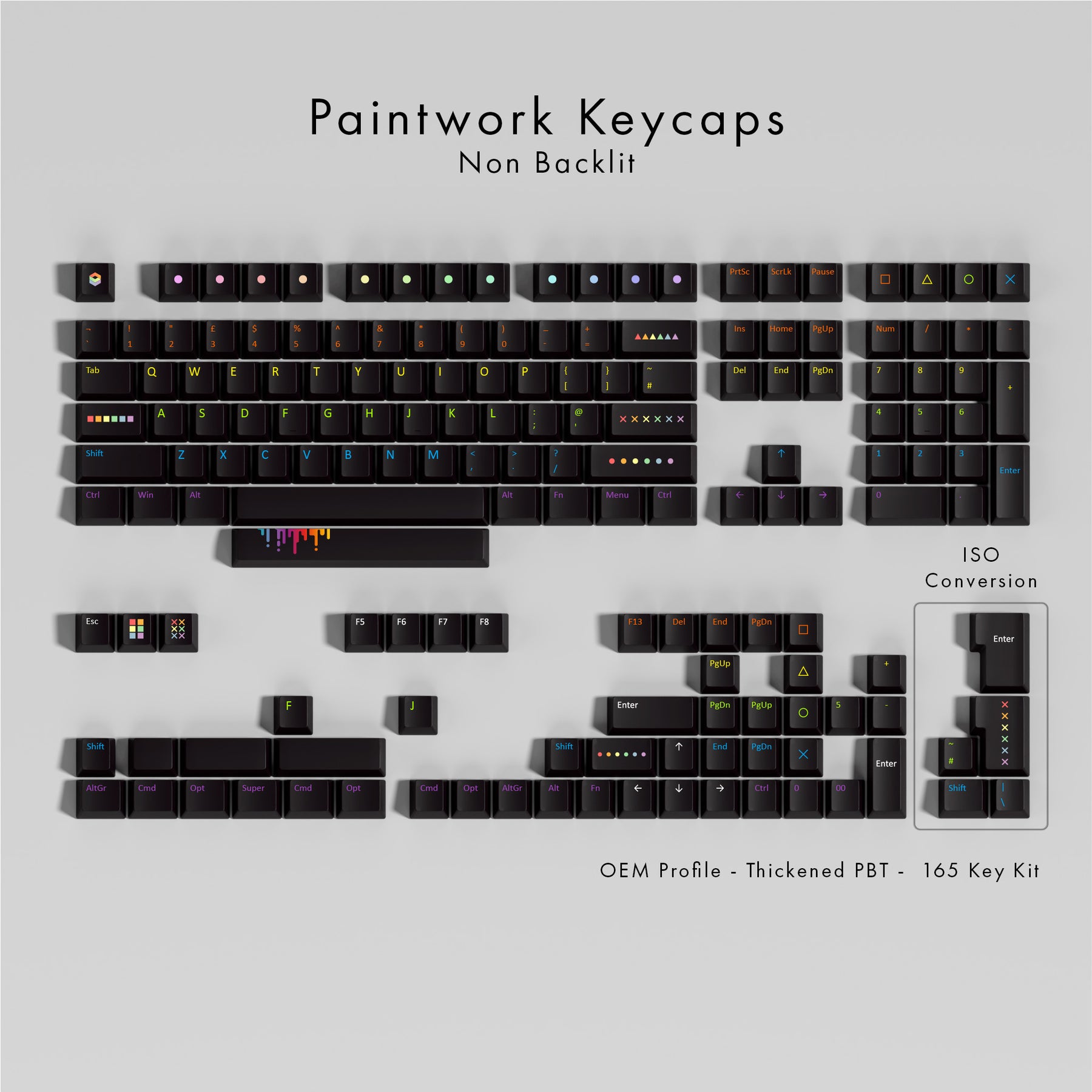 PAINTWORKS QWERTY PBT keycaps on a mechanical keyboard, featuring OEM profile keys with Black Keycaps and Rainbow Text