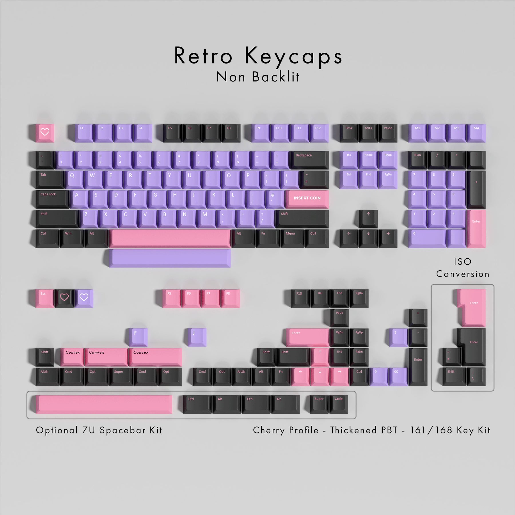 RETRO QWERTY PBT keycaps on a mechanical keyboard, featuring OEM profile keys with Purple, Grey and Pink Keycaps