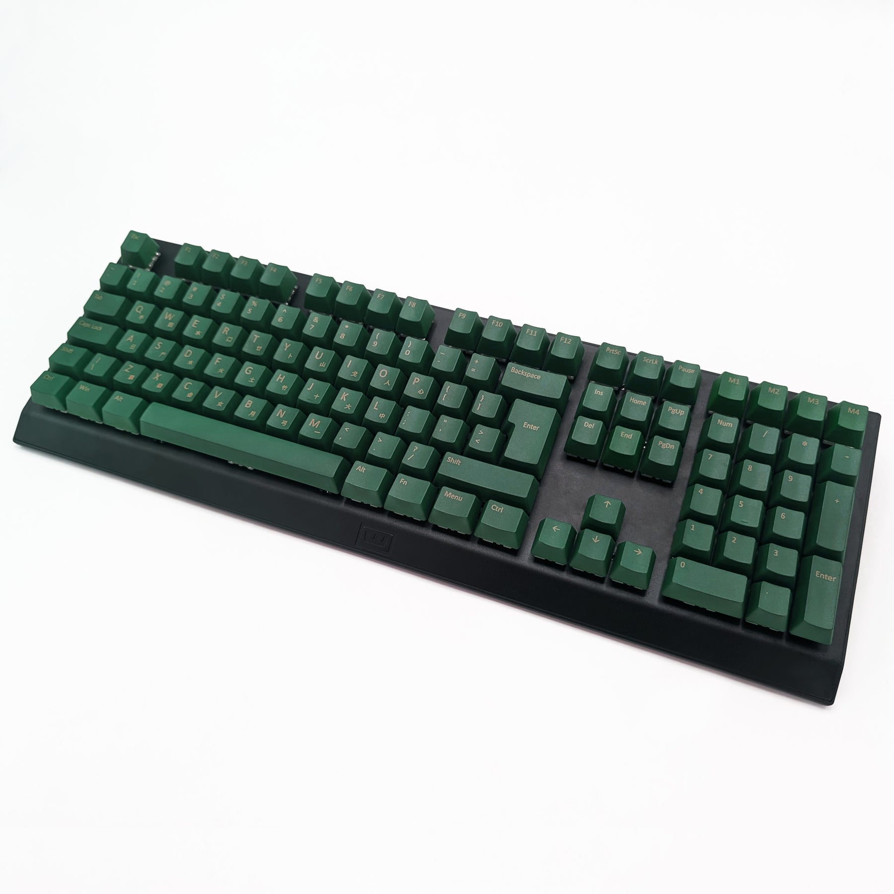 Customisable green non-backlit QWERTY PBT keycaps with gold legends on a mechanical keyboard, featuring OEM profile keys.