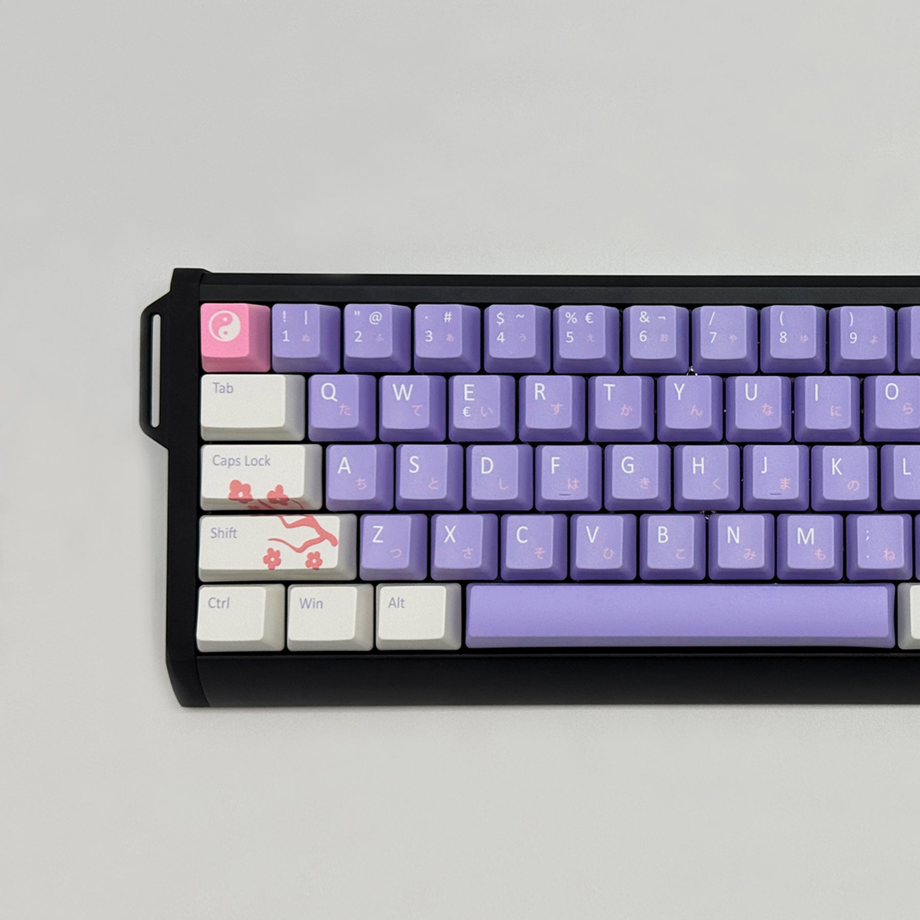 ENTER JAPAN QWERTY PBT keycaps on a mechanical keyboard, featuring OEM profile keys with Purple, White and Pink Keycaps