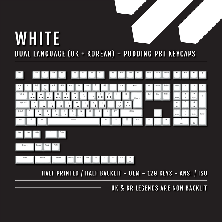 Our Dual Language Pudding Keycaps feature Backlit US legends alongside Non-backlit UK & Korean (Hangul) legends creating a 'Dual Language' effect.